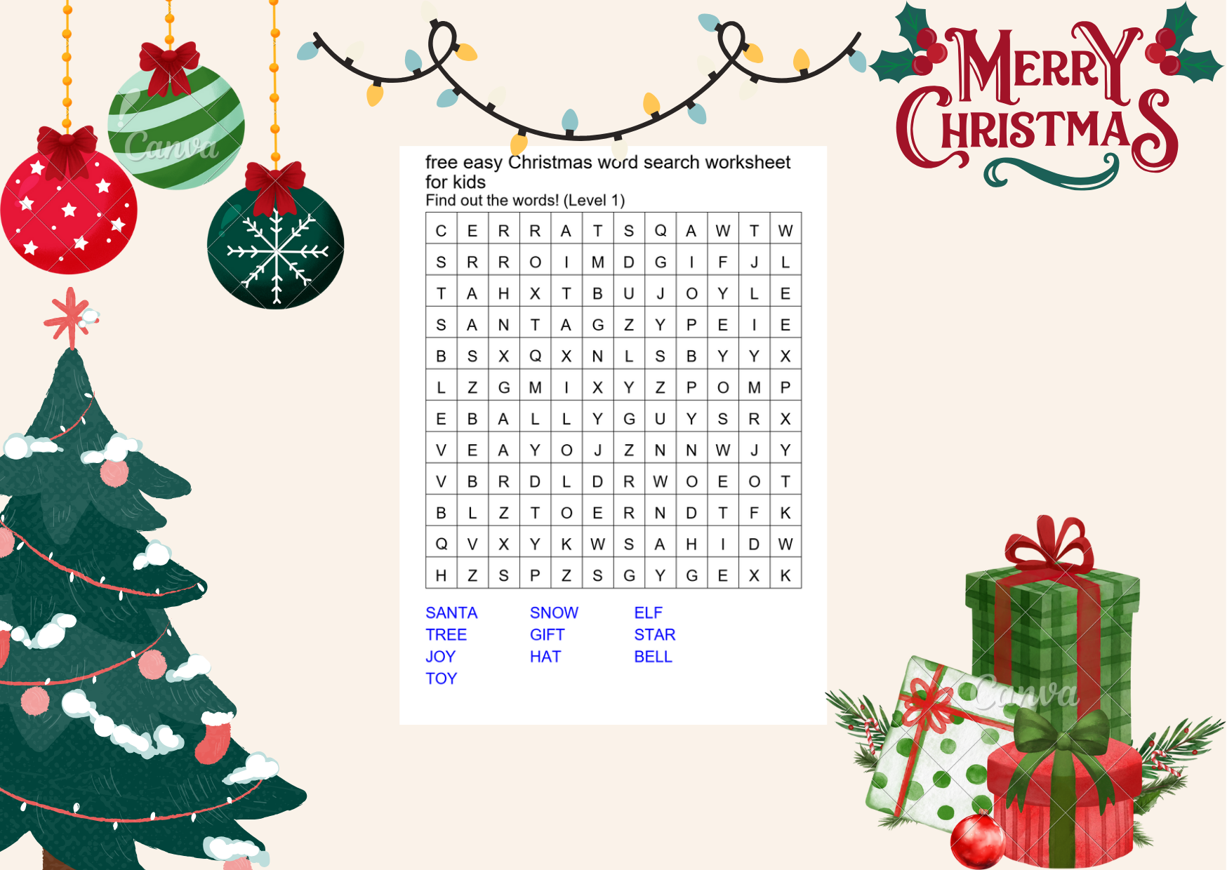 This free easy Christmas word search worksheet for kids is a joyful and educational holiday activity. With simple Christmas-themed words and a colorful design, it’s ideal for preschoolers and early elementary children to enjoy during December in class or at home.